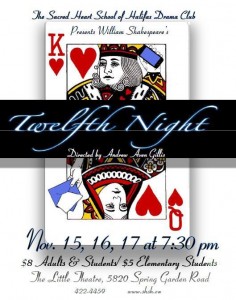 Twelfth Night plays at the Sacred Heart School Little Theatre (5820 Spring Garden Road) tonight, November 17, 2012 at 7:30pm. Tickets are available at the door or by calling 902.422.4459 and they are $8.00 for Adults and Students and $5.00 for Elementary School Students. For more information visit this website.