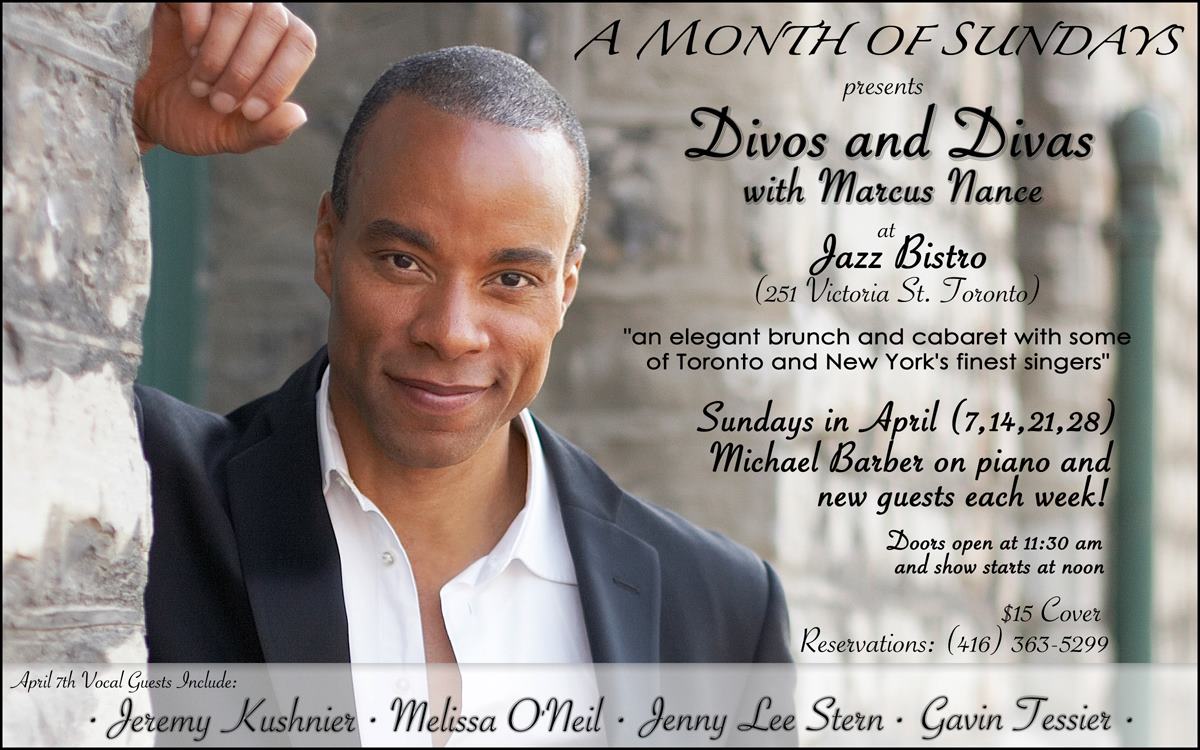 For four Sundays in April Toronto is being treated to two of my favourite things simultaneously: Cabaret and Brunch! The Jazz Bistro (251 Victoria Street) presents Divos and Divas with Marcus Nance. Offering a mixture of jazz, musical theatre, opera and cabaret Nance will be joined by a wide array of guests each week including many of the best singers from both Toronto and New York and accompanied by the incomparable Michael Barber on piano. April 7th musical guests include Jeremy Kushnier, Melissa O’Neil, Jenny Lee Stern and Gavin Tessier. Marcus has recently returned to Toronto from New York where he played Caiaphas in the Stratford/La Jolla/Broadway production of Jesus Christ Superstar and hosted the Cabaret Marcus Nance and Friends at the Metropolitan Room. Other credits include La Boheme (Broadway), Kismet, Of Thee I Sing (New York City Centre Encores!) Four Saints in Three Acts (Chicago Opera Theatre), Porgy and Bess (Toronto Symphony) and Cinderella (New York City Opera). Check out this link for more info. Doors open at 11:30am, show begins at 12:00pm. $15. The Jazz Bistro. Toronto.