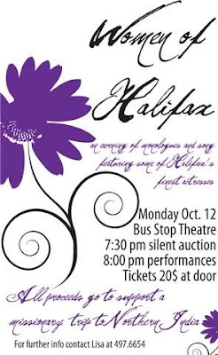 Here is some interesting and inspiring news from Halifax, Nova Scotia. On October 12th, 2009 there will be an eveving of monologues and song called Women of Halifax at the Bus Stop Theatre (2203 Gottingen Street) as a fundraiser to support a mission trip to Northern India. The performance begins at 8:00pm with a Silent Auction at 7:30pm. Tickets are $20.00 and are available at the door or by contacting Lisa Rose Snow at 902.497.6654 or emailing lisarosesnow@hotmail.com.