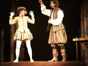 Webb agrees, “There’s nothing like seeing it live. You’re sitting a few feet away from the dog… or from Shakespeare.” For audiences, they have the opportunity during this show to get a peek behind the scenes. As Webb explains, some of the superstitions, traditions, the auditions, the rehearsals, and the “showmances” are an accurate depiction of what life in the contemporary theatre can be like. Some elements depicted in Shakespeare in Love are unique to the past. For example, as Webb says, Viola having to dress up as a man in order to be an actor is historically accurate, as women in the Elizabethan period were prohibited from working in the theatre, “We see men playing the female roles in the play within the play. We have slightly older actors playing boys of a certain frame or stature who would have played the women in Shakespeare’s plays, so that they could portray female characters in these plays. We’re not doing these scenes for laughs. That’s the way theatre was performed in this time. So, when Viola arrives and has to dress up like a boy, much younger than herself, in order to play a women, you really see the double whammy she faces. It’s really interesting seeing Viola’s struggle, because she is trying to be recognized as an artist, but as a women she is not allowed on stage at all, so to have her performing in this play is highly illegal and would result in the theatre being shut down. In today’s society, even hundreds of years later, we still see women in the theatre trying to have their voices heard and to be seen.”