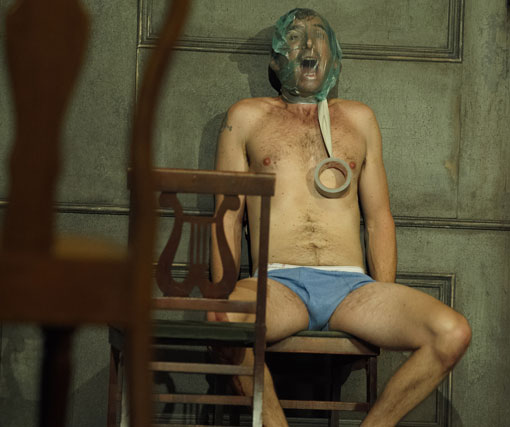 The performances in this production mixed with Graham McLaren’s continually creative staging are mesmerizing. Tara Nicodemo gives a beautiful performance as Ophelia, continually searching for the approval of everyone until her quest to please proves dismally fruitless. Ophelia and Hamlet have a beautiful moment in this production where she reads a magazine as he draws a note for her as he slyly watches her like an enamored nine year old. They then share “Eskimo Kisses,” which alludes sweetly to the innocence of their love, but also suggests the undeveloped nature of Hamlet and Ophelia’s ability to connect in love amid their world of violence. Benedict Campbell gives a brilliant performance as Claudius, who on the one hand seems mostly irritated with his stepson/nephew because he is continually interrupting his sexcapades with Gertrude. Yet, in Claudius’ cold calm, he is contrasted strongly to the impetuous, passionate Hamlet. Hamlet proved that he could kill a man with his bare hands and using whatever objects he could find around him, a deed which ultimately creates a grisly and intense personal relationship between the killer and the victim. Claudius, on the other hand, sits calmly in his home and gives orders that prompt others to do his dark bidding for him. I saw in Campbell’s portrayal of Claudius the chilling image of many leaders and dictators of the 20th Century. Laura de Carteret was fascinating as Gertrude, a woman pulled between the love of a husband and a love for a son. Her Gertrude was obviously emotionally ravaged as she subtly downed pills followed by mouthfuls of booze. She and Ophelia provided two portraits of the same restrained female experience: the girl who belongs to her father, and the woman who belongs to her husband. For both, it seemed, the only means of escape was death. Eric Peterson magically turned the dotty, meddling, busybody Old Polonius into a terrifying force to be reckoned with who demanded that his words be heard and heeded. Gord Rand’s Hamlet, often stooped over shuffling through the mess or hanging in silent contemplation, captured both the sense of a despair so deep that even breathing requires too much energy, and all the manic bursts and flairs that unrestrained, mixed-up feelings evoke.