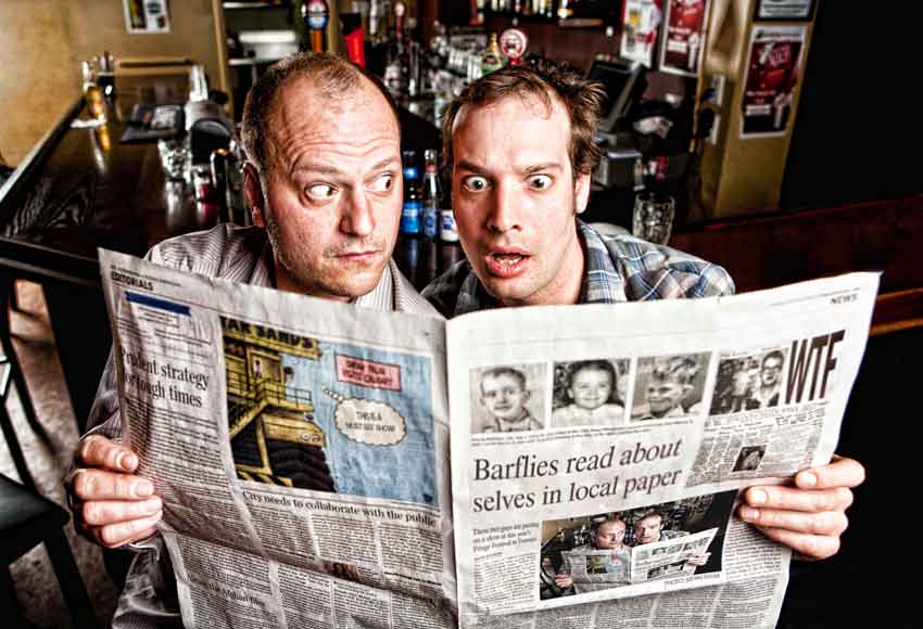 In the continuing quest to liberate improvisation from the shackles of the games of wits perpetuated by Who’s Line Is It Anyway comes James Gangl and Carmine Lucarelli in Barfly on the Wall at Theatre Passe Muraille Backspace as part of The Toronto Fringe Festival, a show that is entirely improvised based on a short interaction with one of its audience members and a perusal through the local newspaper.