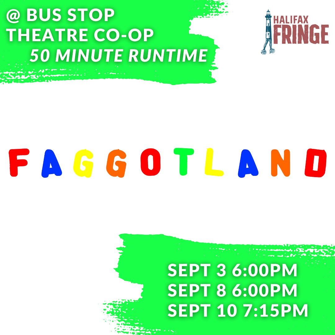 F*ggotland plays at the Bus Stop Theatre (2203 Gottingen Street, Halifax) at the following times:
