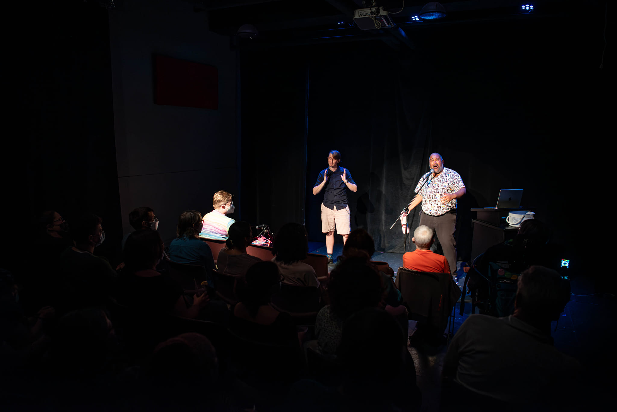The next show I saw was The Velvet Duke’s All Request Radio, which was also in the Windsor Studio. I have seen some live musical improv before, where improvisers create brand new songs on the spot based on audiences’ suggestions, but whenever I’ve seen this done before there’s usually a piano player who follows the lead of the improviser. The Velvet Duke gets song title suggestions from their audience, and then there is some sort of randomizer on the computer that gives them a backing tack in an array of different styles, so not only does The Velvet Duke have to improvise the lyrics, but they also have to make the song work somehow with the track! This was very entertaining to watch. We were treated to a countdown of ten improvised songs, including hits like “Get Yourself a Cat,” “Please Don’t Eat My Turnip,” and “My Heart is a FlufferNutter.” I also was not expecting there to be special guests but Rooks Field-Green and Kiana Josette both did their own very solid improvised songs as well! This is the kind of show that is unique to Fringe Festivals, and having the guests can really help create community and camaraderie among local and visiting artists.