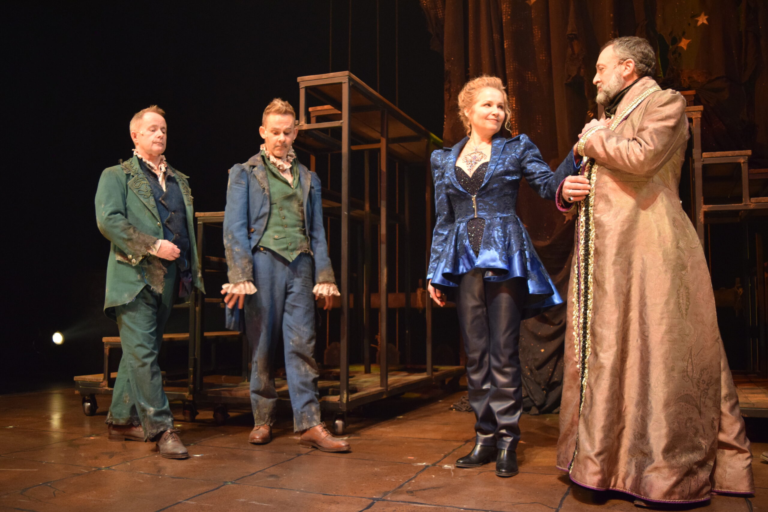 The other characters are members of a theatre troupe heading to Hamlet’s home of Elsinore to perform the now-famous play The Mousetrap for the court there. “I play a tragedian- part of this acting troupe,” explains Raquel Duffy, “and then on top of that I play Gertrude, Hamlet’s mother, and these scenes from [Shakespeare’s Hamlet] come into Rosencrantz and Guildenstern’s world, so they come to life through the tragedians.” Sampson adds, “We are coming to drive the action around Rosencrantz and Guildenstern. It’s really really fun to to play… it’s almost like playing the fates from the Greek mythos. When something needs to happen then all the sudden: there we are to make it happen. I find it really beautiful to play that spritely character that lives in the in-between- playing in that liminal space. Whether or not we know we’re playing in it is also fun to play with as an actor.” “How I imagine it,” says Duffy, “we’re the theatre. We are the ghosts of all the actors who have ever played in this space, and we’ve sort of come out of the woodwork into life in order to move the story forward.”