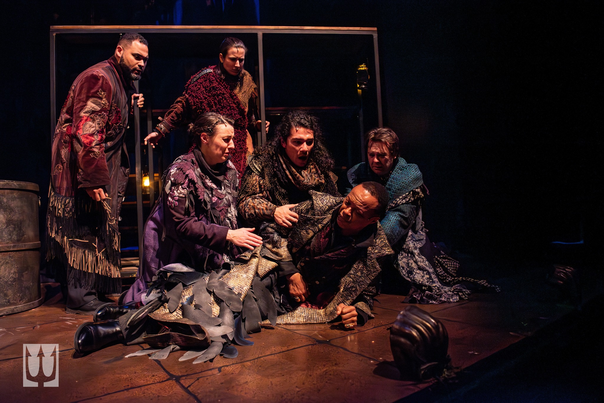 The set by Andrew Cull is made up primarily of two risers on wheels with the backdrop of a shabby ship’s sail, which can double as a stage curtain. Here most of the technical theatre magic happens before the audience’s eyes (quite literally the wheels are showing). The Tragedians move the risers to suggest the waves, for example, when Rosencrantz and Guildenstern travel by boat to England with Hamlet. You get the sense that Hamlet is being performed in a typical theatre space, like inside the Maitlands’ house in Beetlejuice, while Rosencrantz and Guildenstern Are Dead is being performed in the Upside Down World outside of it. Similarly, the costumes by Kaelen MacDonald suggest the players as time travellers as well. Most striking is Raquel Duffy, who plays Hamlet’s mother, Gertrude, who is dressed in a very contemporary costume that makes her look like a rockstar. Perhaps she is the play’s nod to the recent trend of doing Shakespeare in modern dress. Although we don’t get to see much of her relationship with Claudius, the way she is dressed makes their dynamic inherently interesting. She doesn’t look like she exists simply to be someone’s mother. She clearly has her own arc and emotional journey through becoming a Queen, raising her son, the death of her husband, and becoming her brother in law’s wife that we never see. Does Hamlet reduce Gertrude to clichés when he assumes what her feelings and her motivations must be? How much choice does she have in the way the events play out? Duffy’s portrayal makes Gertrude even more mysterious as she doesn’t attempt to answer any of these questions. Unlike her clothes, she is reserved and guarded, behaving the way one would expect a Queen to behave, but very unlike the mother of distraught son. This strengthens the sense of the intense chokehold that Claudius has over everyone in his orbit.