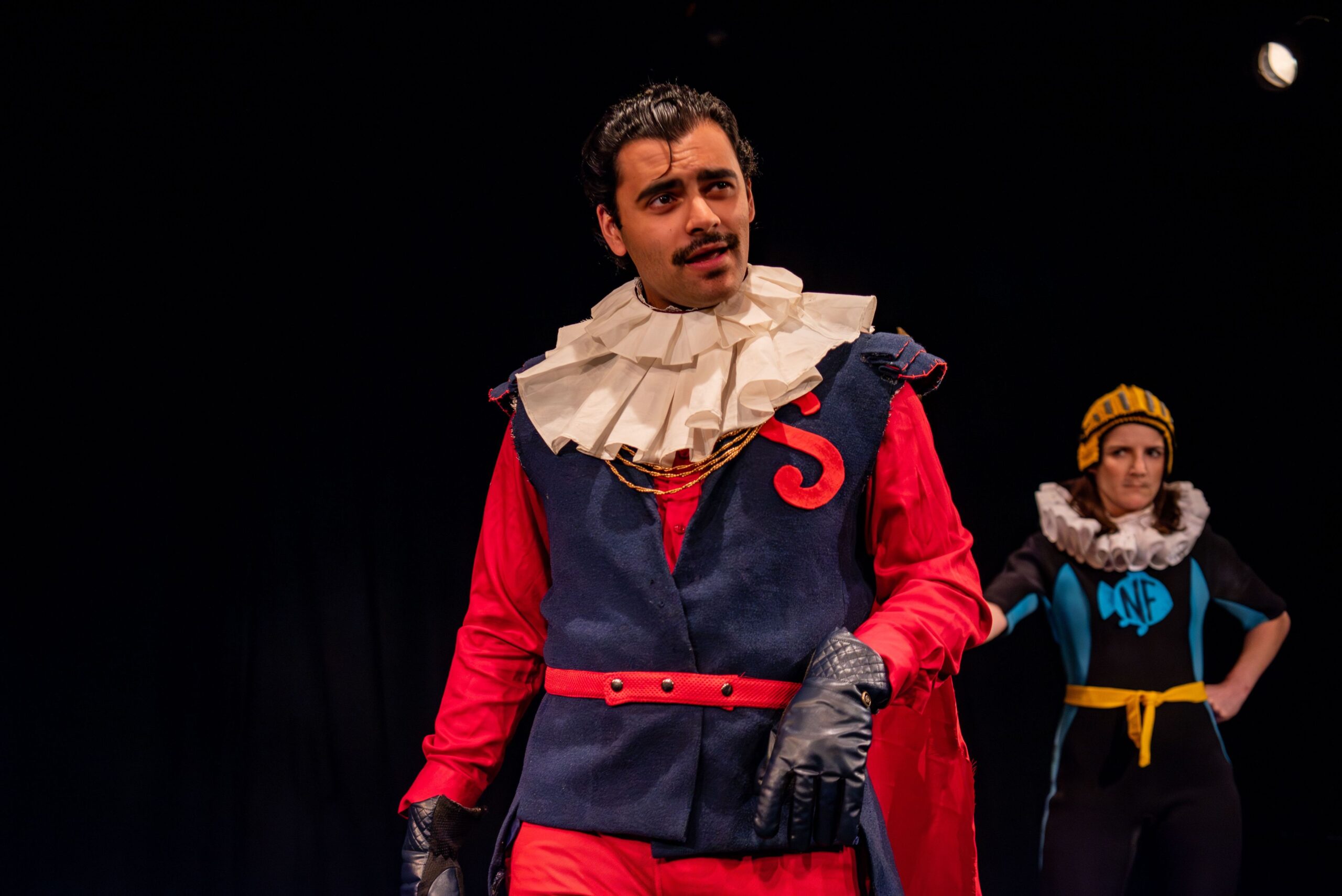 We open in London Town. Bill Shakespeare (Ira Henderson) and Clark “Kent” Marlowe (Deivan Steele) are competing for audiences at the local Fringe theatre festival. Shakespeare is trotting out one of his Henrys and Marlowe is premiering Dr. Faustus. Shakespeare is very sullen and aggrieved, and as is his superhero counterpart the Knight of the Bat. They have both been abandoned by their sidekicks (Dick Son of Grey/Robin Goodfellow played by Rachel Lloyd), and they miss the unwavering love and council they once received from their Cockney nurse Alfreda Halfpenny (Colleen Arcturus MacIsaac), who was sadly killed in the previous instalment. Knight of the Bat is also annoyed and threatened by a new superhero on the scene Superb-Man, who looks a bit like Kent (only without the glasses). Will Shakespeare/Bat’s jealousy of Marlowe/Superb-Man lead him to conspire with the dark side of Lex Lutheran (Pasha Ebrahimi) or will justice prevail?
