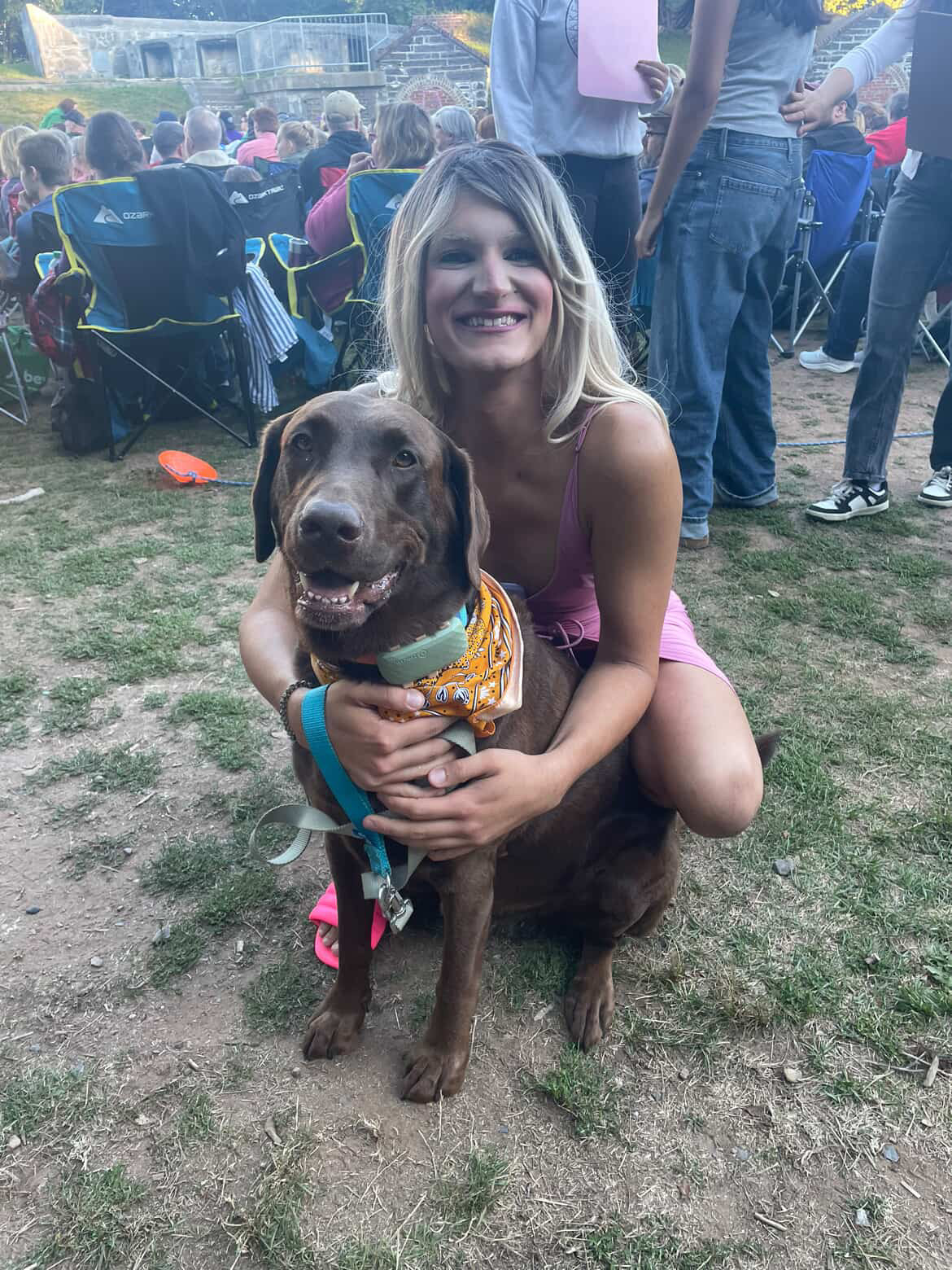 I was amazed by how cohesive it was- especially concerning the exits and entrances, which the performers were largely making up as they go; it’s almost as though years and years, and in some case decades worth of performing Shakespeare plays outside in this venue renders it second nature for these actors to direct themselves. The most chaotic aspect of the show was the hodgepodge of costumes, but this was actually the element that I enjoyed the most. Matt Lacas played Tybalt as a black cat, and then attended the masquerade ball in one of those inflatable T-Rex costumes. Chris George legitimately looked a hundred years old as Juliet’s “daddy,” the menacing Capulet who doubled as a Sith Lord, with a little bit of Larry David energy. Patrick Jeffrey brought us Gandalf as Friar Laurence, which made for a nice counterbalance. Similarly Zach Colangelo was Paris Hilton as Petra, the Nurse’s page, who spoke with maximum vocal fry, and was accompanied by her faithful dog, Moose, played by Colangelo’s real dog, also Moose, who at one point got ahold of Gandalf’s wooden staff and started playing tug of war with it in a moment that could not have been better scripted.