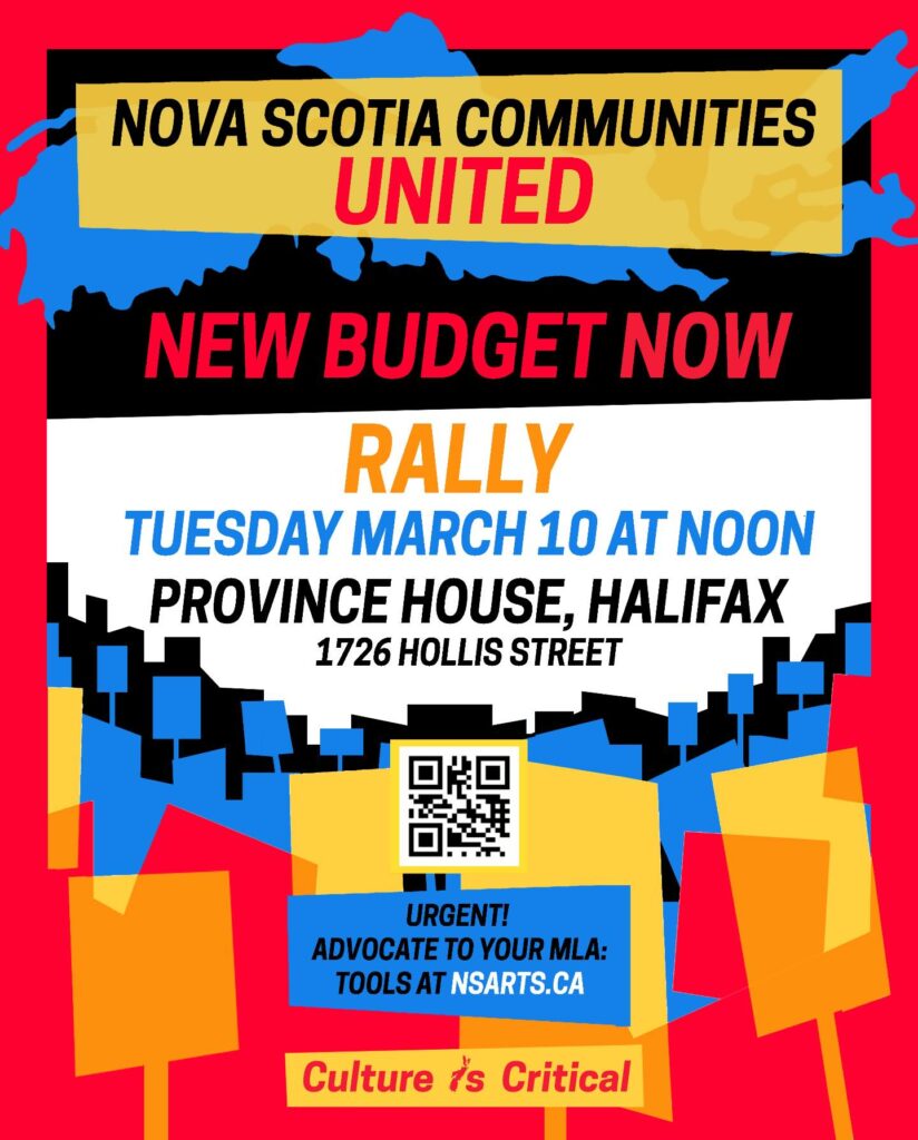 At the rally on Wednesday Chris O’Neill, Executive Director of Ross Creek Centre for the Arts and member of the Nova Scotia Arts Coalition, gave a passionate speech that was also rooted in truths and facts. She said in part: “There is no longer any doubt about the vital importance of Arts, Culture and Heritage on education, health outcomes, and our economy. The evidence is clear. In every area that this government says it wants to succeed, Arts, Culture, and Heritage are key to that success. Tim Houston says he wants to improve Nova Scotian health care. Then invest in the arts. Involvement in the arts reduces use of the health care system and improves the mental and physical health of communities. It allows us to recruit health care workers to our province when there is a vibrant cultural community. Tim Houston says he wants to modernise Nova Scotia. Then invest in the arts. Modernising doesn’t mean abandoning the communities that have shaped this place with vibrant cultures that make us unique in Canada. It does mean investing in creativity. We are the change makers, the visionaries, and the creative and nimble thinkers. And Tim Houston obviously needs us. Tim Houston says he is ‘only doing what Nova Scotians told him to do.’ Did we tell him to devastate the cultural landscape of Nova Scotia? Did we ask him to change Nova Scotia from a place of a thousand welcomes to a place with shuttered tourism offices, abandoned museums and fewer musicians, theatres, writers, artists and others who enrich our lives and tell the stories of Nova Scotia both to ourselves and to the world? Tim Houston’s government has told citizens who are impacted by these disproportionate cuts- and we will all be impacted by these cuts- that cultural workers need to… ‘Do their share.’ I’m here with you today, to give a message to Tim Houston’s government: We are doing our share! There are 14,000 cultural workers across this province, more than in agriculture, fishing and forestry combined. Workers who make art, who help our children learn to tell their stories, who keep seniors connected to their communities and families through music and movement, workers who tell our stories and the stories of our ancestors, and the stories of worlds we haven’t even imagined yet (and even tell the stories of gay Hockey Players). For every dollar the government invests in the very programs they propose to cut, we generate an additional $4.59 into our communities and create 8,000 more jobs. We contribute $331 Million in tax revenues to the province. We generate $2.6 Billion in GDP. I am not an economist but I know that is a good return on investment.”